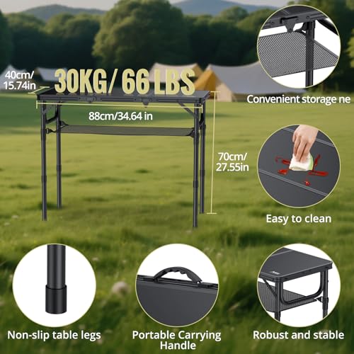 Anbte Folding Camping Table with Storage Net, 3ft Camping Table Aluminum Folding Table with 3 Adjustable Height Max 27.5 Inch Picnic Table Portable Table for Outdoor Backyard BBQ, Pure Black