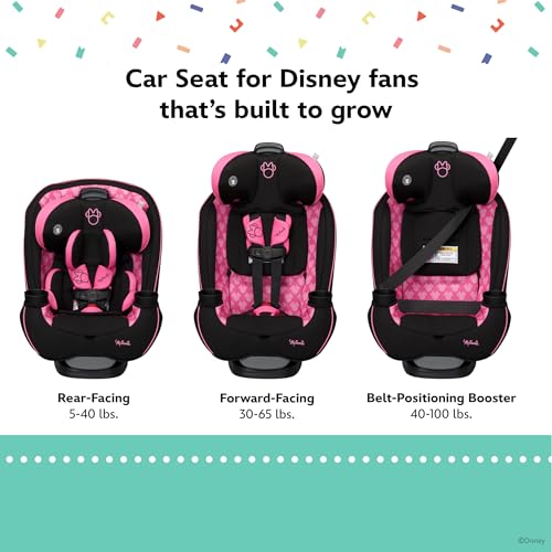 DISNEY BABY GROW AND GO ALL-IN-ONE CONVERTIBLE CAR SEAT Features 3 modes: rear-facing car seat for baby (5–40 lbs., 19″–40″), forward-facing car seat for toddlers (30–65 lbs., 34.4″–49″), belt-positioning booster seat (40–100 lbs., 43.4″–52″).