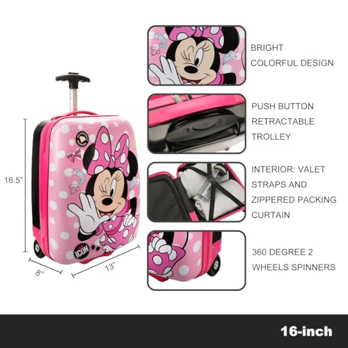 Travel in style with this Disney Minnie Mouse luggage, displaying a charming image of Minnie Mouse against a pink background filled with bows and shooting stars. The luggage is equipped with two smooth-rolling wheels, a retractable handle for easy transport, and interior valet straps to secure your belongings. Made with durable ABS and PC materials, this bag is easy to maintain. Simply wipe it clean when needed.