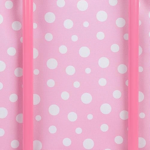 Add playful charm to your child’s travels with this pink Disney Minnie Mouse youth pilot case. Featuring Minnie surrounded by sunglasses, diamonds, shooting stars, and bows on a white polka dot background, this bag delivers fun on the go. The telescopic retractable handle and two wheels make rolling easy, while the interior mesh pocket keeps small items organized. Crafted with sublimated 600D poly, it ensures durability. Wipe it clean for easy care.