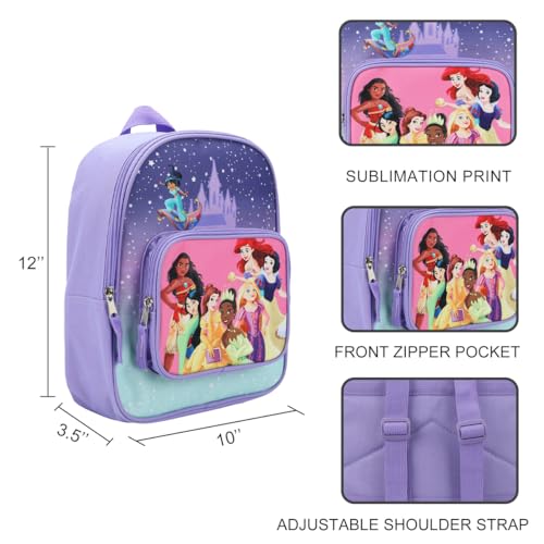Embrace the magic of Disney with this enchanting Disney Princess 2-pack luggage set. The set features a charming 16″ rolling luggage adorned with beloved princesses Moana, Mulan, Belle, Tiana, Rapunzel, Snow White, Ariel, and Jasmine in front of the iconic castle, complemented by a matching 12″ mini backpack. The luggage is designed with two rolling wheels and a retractable handle for easy transport, while the backpack offers two zipper pockets and adjustable shoulder straps. Crafted from durable materials, both bags are easy to spot clean, making them perfect for young fans on the go.