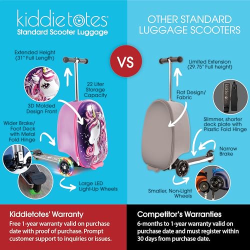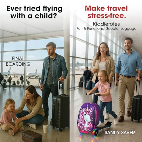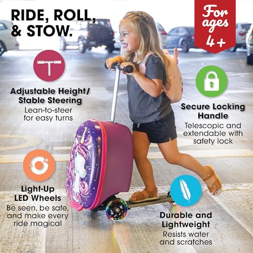 KIDDIETOTES Ride-On Scooter Suitcase for Kids – Hardside Lightweight Carry-On Luggage with Foldable Scooter, LED Wheels, Travel Fun for Toddlers & Children