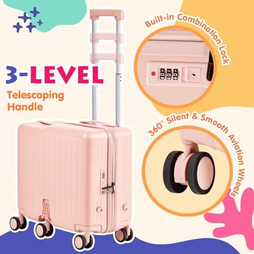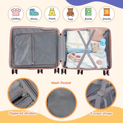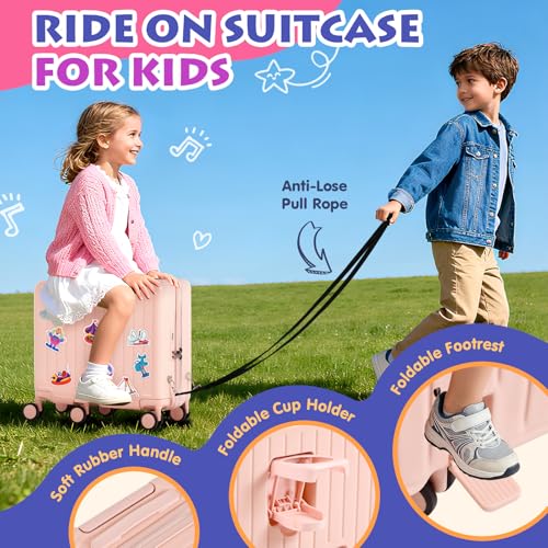 smilesun Kids Ride-On Luggage, 20″ Hardshell Carry-On Suitcase with 6 Spinner Wheels, Foldable Pedal, Hidden Cup Holder & Combination Lock for Toddlers & Children (Light Pink, 20-inch)