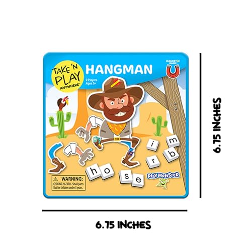 Product Description Take ‘N’ Play Anywhere games feature big magnetic playing pieces that are easy for kids to use and hard for kids to lose! The convenient 6 3/4″ square tin case makes it easy to slip the games into most bags to take everywhere and keep kids entertained on a trip, waiting at the doctor’s office, dining out, while stuck in traffic or just visiting grandma’s house! From the Manufacturer Take ‘N’ Play Anywhere games feature big magnetic playing pieces that are easy for kids to use and hard for kids to lose. The convenient 6 3/4″ square tin case makes it easy to slip the games into most bags to take everywhere and keep kids entertained on a trip, waiting at the doctor’s office, dining out, while stuck in traffic or just visiting grandma’s house. In Hangman, these magnetic pieces allow you to play this word game anywhere. Guess an incorrect letter and a body part is added. Solve the word before you’re hung.