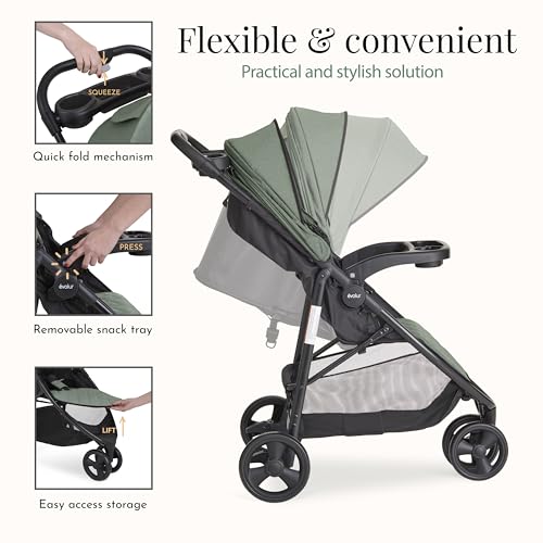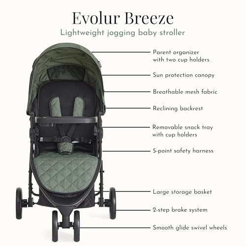 Evolur Breeze Stroller in Green, Adjustable Backrest & Canopy, Compact Fold Lightweight Baby/Toddler Stroller with Storage Basket