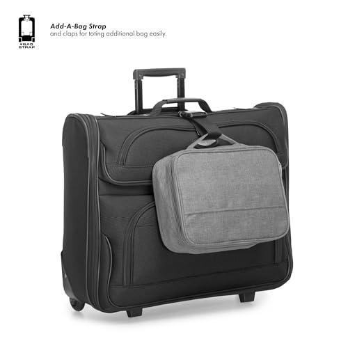 The Travel Select Amsterdam business rolling garment bag is ideal for keeping your clothes crisp and clean while you are traveling. This garment bag is made of industrial quality hardware; 1200D two-tone polyester construction with an EVA reinforced front panel to resist rips and tears. It features an ergonomic handle system, inline skate wheels, and an adjustable and detachable shoulder strap with a non-slip pad. It has a spacious main compartment with zippered mesh pockets and multiple outside gusseted pockets for easy packing. The convenient tie straps secure items while the fold-out design helps to reduce wrinkles in suits. Plus, the top carry handle is designed for easy lifting and the center add-a-bag strap is built in for carrying smaller bags. Product Dimensions: 21″H (44″ opened) x 23″W x 7″D. Weight: 9.3 lbs