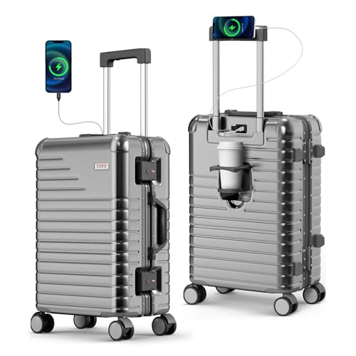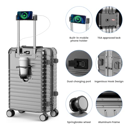 20 Inch Carry on Luggage with Cup Holder, Airline Approved 22x14x9 Aluminum Frame PC Hard Shell Suitcase, 360° Spinner Wheels, TSA Lock for Short Trips and Business Travel