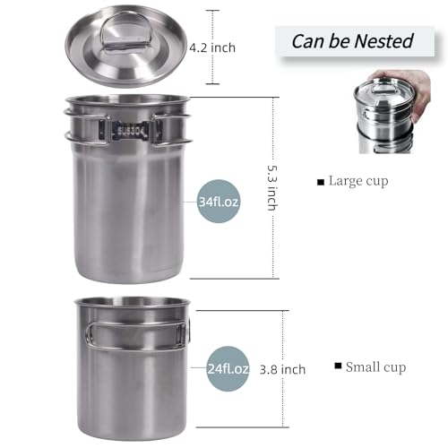 Lightweight and Durable:Stainless steel camping cookware features 418g weight ,Compared with other materials such as aluminum and titanium, the stainless steel material makes the Camping Coffee Mug cups more durable rust resistant but lighter on your bag