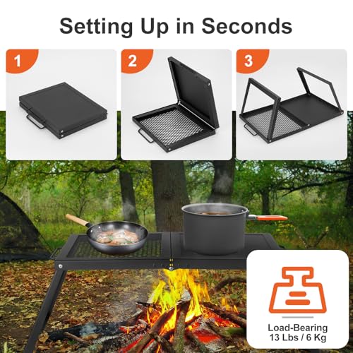 Premium Material – Upgraded sturdy thickened legs for keeping stable for not tip over while camping cooking or campfire grilling. Made from heavy-duty steel, coated black that can resists high-temperatures of 932F/500 degree, it is suitable for campfire grilling and outdoor cookware.