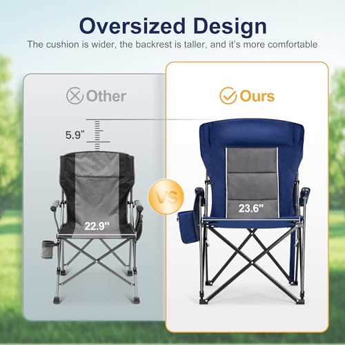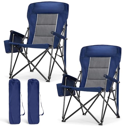LET’S CAMP Oversized Camping Chairs 29.52″ High Back Heavy Duty Lawn Chair Support 500LBS, Portable Collapsible Chair with Cup Holder, Side Pocket,2 Pack(Blue)