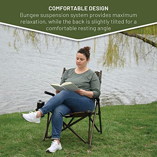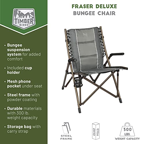 OUTDOOR BUNGEE CHAIR: This TIMBER RIDGE camping chair with padded seat, hard armrests, cup holder and carry bag is the ideal lounge chair for camping, patio or sideline sports. It supports 300 lbs