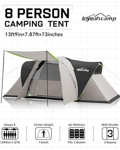 8 Person Larger Extended Dome Camping Tent with 3 Rooms, Waterproof Semi-Freestanding Family Outdoor Tent with Spacious Interior and Mesh Windows