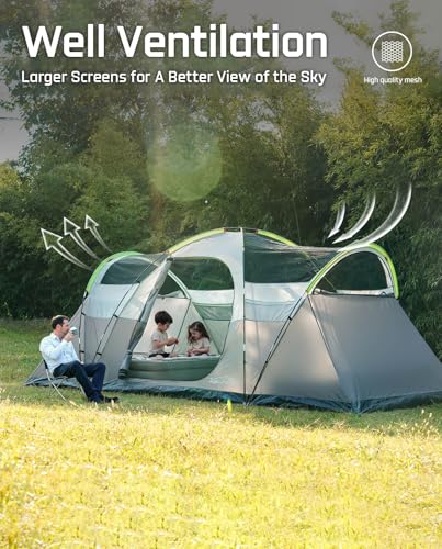 Excellent Ventilation Design: Large camping tent desinged with quality mesh for top roof, door and windows. Breathable design of large area of mesh allow more airflow in and out, besides, you will enjoy the panoramic view from tent window and take pleasure in watching starry sky when you lying in tent with your families.