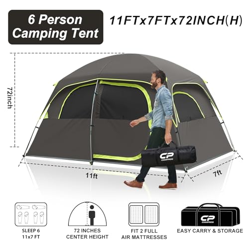 🏠 SPACIOUS 6-PERSON FAMILY TENT Experience generous comfort with an expansive 11×7 ft footprint and 72-inch center height. Easily stand and move around without hunching over. This cabin-style tent is engineered to comfortably accommodate 6 campers or a queen-size air mattress with plenty of room left for your camping gear, making it the perfect basecamp for family adventures and group getaways.