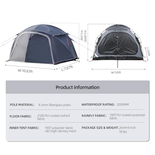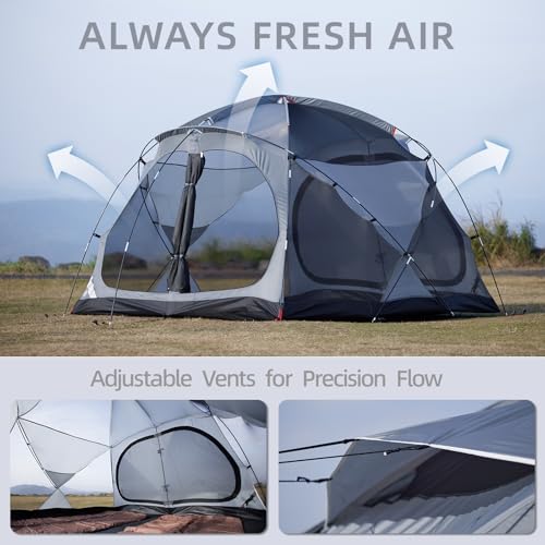 Spacious and Adaptive Dome-Shaped Interior: With inner dimensions of 84.6″ × 84.6″ × 61″ (~7m²), the tent comfortably accommodates 3-5 people for sleeping and gathering. The dome design optimizes vertical and corner space usage, creating a functional living area where every inch serves a purpose.