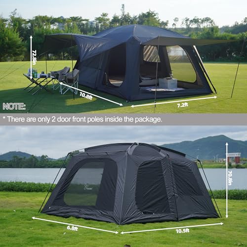 2 ROOM TENTS: With a separated curtain, the tent becomes two room cabinet tent, which improves privacy. Full set: 1 x tent, 1 x rainfly, 1x tent Poles, 16 x tent stakes, 8x guylines, 2x door front poles (59.05″ Length) and 1x carry bag. NOTE: there are only 2 door front poles (59.05″ length) inside the packaging, and the other poles need to be purchased separately or replaced with tree branches.
