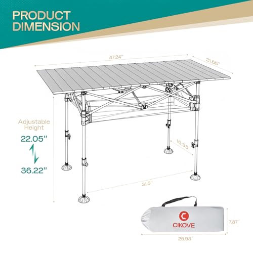[Adjustable Height & Spacious Design] Stepless height adjustment (22”-36”) adapts to camping tents, BBQ grills, and beach chairs. allowing table to adapt to grass, sand, or uneven ground. Collapses to 7.9”x26” compact size for effortless trunk/closet storage. 47”x22” surface holds 300 lbs with reinforced edge support.