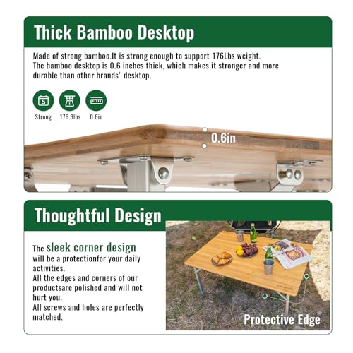 100% Bamboo Top – Tired of flimsy aluminum tables with slats that move or flex? Our solid 12mm bamboo surface offers a smooth, durable top with a natural look and feel. Strong and built to last through every camping season.