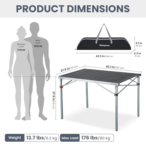 KingCamp Aluminum Folding Camping Table, 42.1″ Foldable Lightweight Roll Up Camp Table Heavy Duty 2-6 People Portable Table for Camping Picnic BBQ RV, Indoor & Outdoor, Silver Black