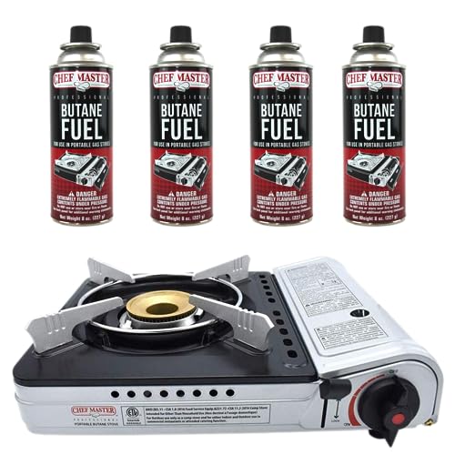 12,000 BTU Portable Butane Camping Stove with 4 x 8oz. Butane Fuel Canister Combo, Double Wind-Guard Portable Stove w/Carry Case for Road Trips, Camping, Tailgating & Emergencies by Chef Master 90235