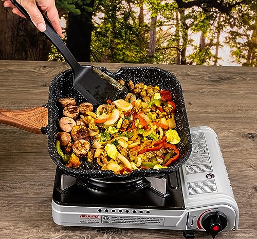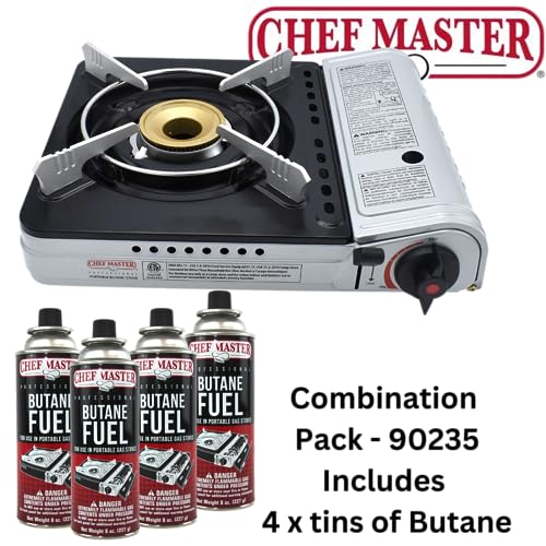 EXTRA POWERFUL 12,000 BTU PORTABLE STOVE — The Chef Master 90235 Butane Burner delivers an impressive 12,000 BTUs of cooking power, making it a top choice for both indoor grilling and rugged outdoor cooking. Featuring a dial-controlled flame and Piezo electric ignition, this stove lights instantly—no matches or lighters needed. Perfect for backpacking, car camping, tailgating, or emergency preparedness, its compact yet high-output design ensures fast, efficient cooking wherever you go.
