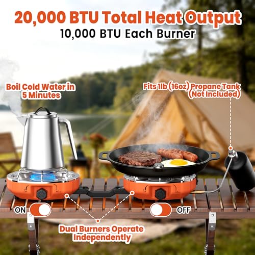 Dual Burner with Powerful Heat Output: This portable camping stove features two burners with a combined 20,000 BTU output, making it ideal for cooking multiple dishes outdoors. Whether you’re using it as part of your camping cooking set or need a reliable backpacking stove for your adventures, it delivers the power and convenience you need for outdoor meals