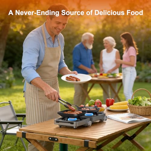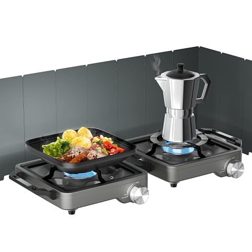 Efficient Dual Burners: 2.2-inch burner spacing easily accommodates various camping cookware, effortlessly preparing coffee, fried eggs, and bacon simultaneously