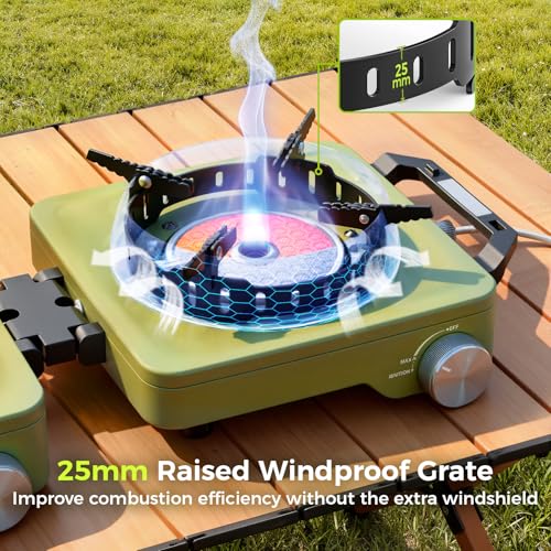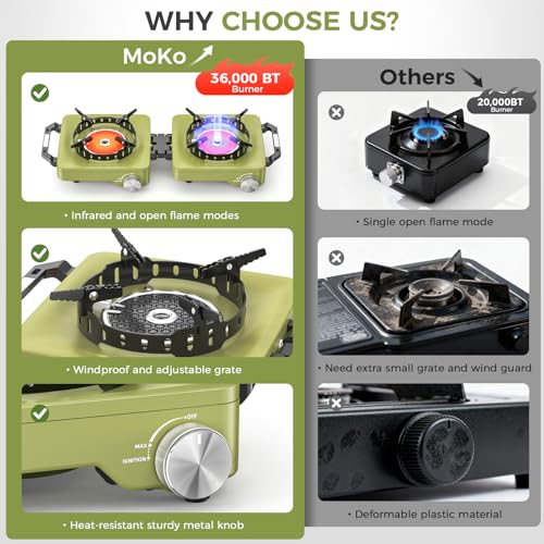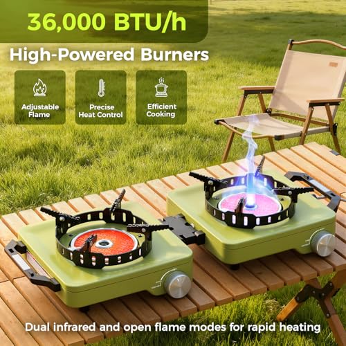 MoKo Propane Camping Stove 2 Burner, 36,000 BTU Infrared & Open Flame Hybrid, Windproof Folding Portable Outdoor Gas Cooking Kit with Frying Pan & Carry Bag For RV, Tailgating, Survival, Green
