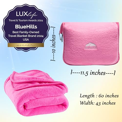 BlueHills Premium Soft Travel Blanket Pillow Airplane Blanket Packed in Soft Bag Pillowcase with Hand Luggage Belt and Backpack Clip, Compact Pack Large 2 in 1 Combo for Any Travel (Pink T004)