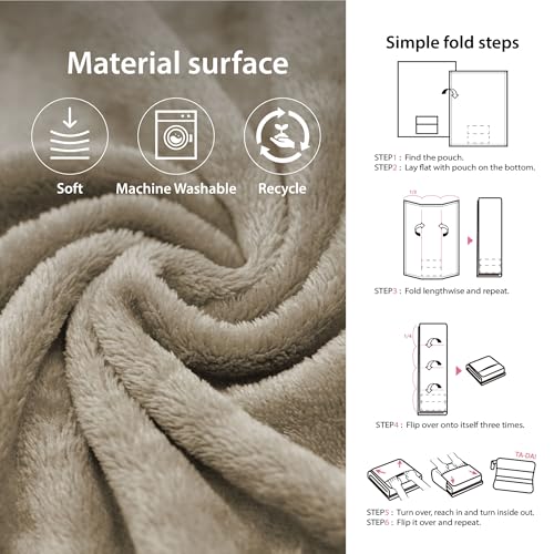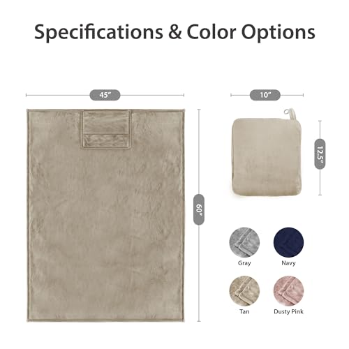 DEZ FURNISHINGS 4-in-1 Travel Compact Blanket Pillow Super Soft Velvet with Luggage Sleeve and Backpack Clip, Tan, 60″ x 45″