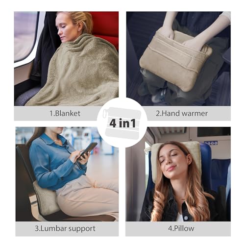 Versatile Companion: 4-in-1 design seamlessly blends a travel blanket and airplane pillow into one compact package. Soft blanket with the sewn-in pocket effortlessly transforms into a travel pillow or lumbar support.