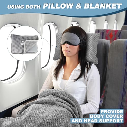 Travel Blanket Airplane Compact with Bag, Travel Essentials 3 in 1 Packable Airplane Blanket, Travel Pillow and Blanket Set, Inflatable Pillow, Luggage Sleeve & Backpack Clip (Light Grey)