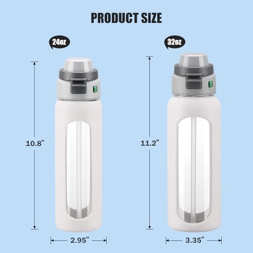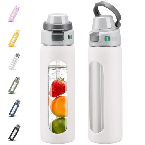 MUKOKO 2-in-1 Borosilicate Glass Water Bottle with Straw for Sports and Travel, 24oz Drinking Bottle with Silicone Sleeve, BPA Free, Leak Proof, White