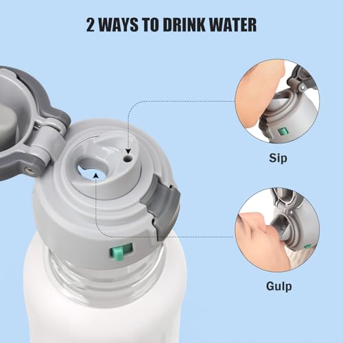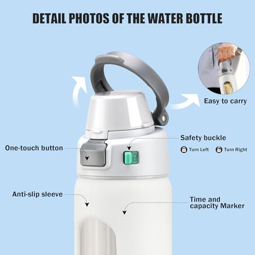 Innovative Dual-Purpose Lid:The straw lid of glass water bottle offers two ways to drink. Whether you prefer sipping through a flip straw or chug from the spout mouth, the unique 2-In-1 Lid got you covered. The leak proof lid also features a one-click snap lock and dust-proof cap for a cleaner and more hygienic drinking experience. One-handed operation: push up to lock, push down to unlock.