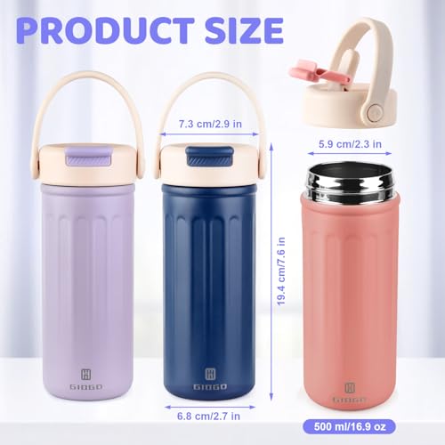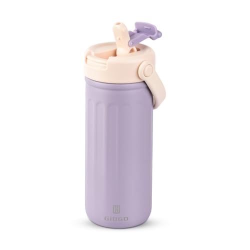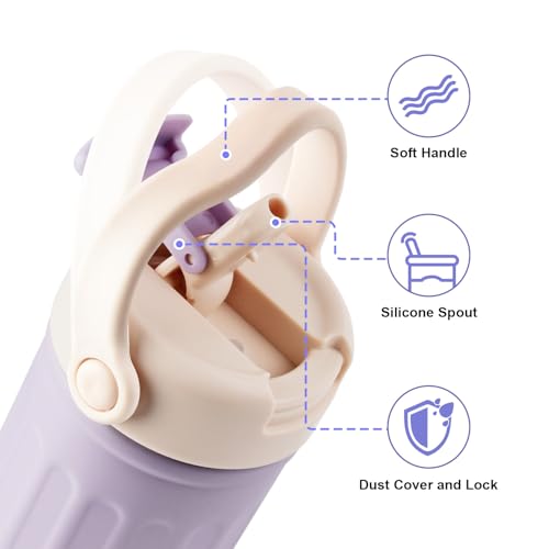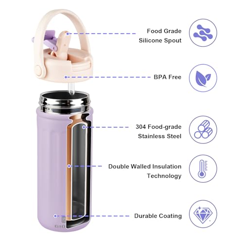 Thermo Water Bottle with Straw, 16oz/500ml Insulated Water Bottle with Handle, Stainless Steel Wide Mouth Water Bottles, Insulated Vacuum Thermo Bottles for Sport, Travel and School, BPA Free, Purple