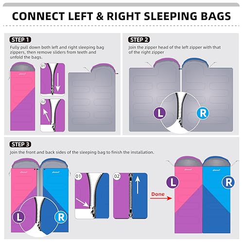 FEATURES YOU SHOULD KNOW: 1. Updated extra patch design applied to the kids sleeping bag prevents annoying zipper snag. 2. Mummy hood with strap offers extra warmth to your head and cocoon your self in, drawstring cord adjust tightness as you wish. 3. Touch Fastener for the zipper prevents the unexpected unzipping during night. 4. Separated zippers make this adult sleeping bag great for both cold and warm weather!