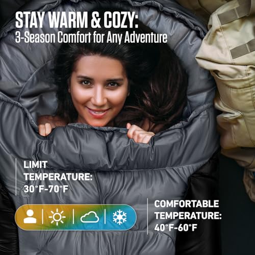 3-SEASON WARMTH & BREATHABILITY – Designed for comfort in temperatures from 30-70°F, this sleeping bag keeps you warm on chilly nights while preventing overheating in milder weather. A breathable design and two-way zipper let you adjust airflow for the perfect sleep temperature in spring, summer, and fall.