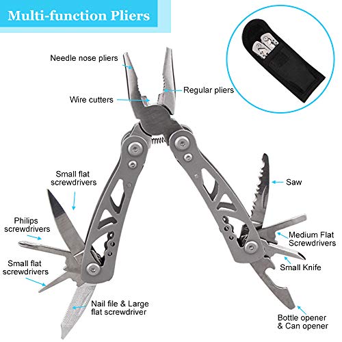 [Multi-funcion Tool]: The steel tool card is a multi-tool, including can opener, screwdriver, ruler, cap opener, 4 position wrench, butterfly wrench, saw blade, direction ancillary indication, 2 position wrench, and a key ring holder. The flashlight has High / Low / Strobe Light Modes.(The battery of flashlight is not included.)