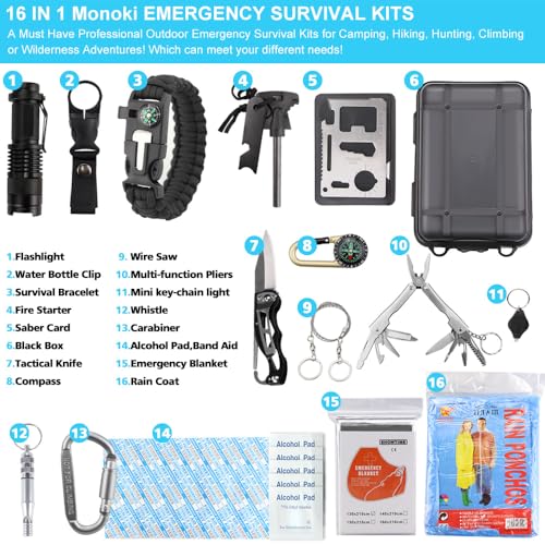 [16 in 1 Waterproof Case]: Stainless Steel Versatile Tool Card, Fire Starter, Compass, Wire Saw, Emergency Whistle and Flashlight . Also including emergency blanket. One emergency survival gear can meet your different needs. The box size is 5”X 3.5”X1.6”, weight is 6.3oz.