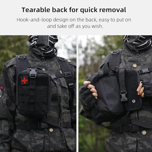 This portable first aid kit, size 5.9”*3.94”*7.87”. Contains basic first aid and survival essentials. Made of high quality nylon fabric, wear-resistant and durable.Molle compatible gear, can be compatible link with belt, tactical undershirt, chest gear, car seat, backpack, etc.IFAK pouch back is hook-and-loop design, can be quickly accessed in emergency