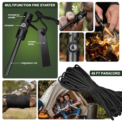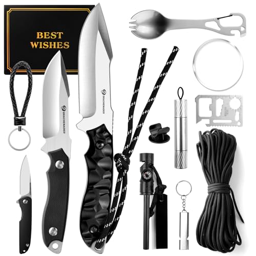 ALL-IN-ONE CAMPING GIFT SET: This set has everything for any adventure—two fixed-blade knives, a folding knife, fire starter, multi-tool card, whistle, keychain, window breaker, paracord, and spork. Be ready for anything, anywhere.