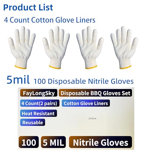 Reusable Cotton Liner & Disposable Nitrile Gloves: Includes 100 nitrile gloves and 4 cotton gloves (machine-washable, heat-resistant, sweat-absorbent, breathable). Put disposable cooking gloves over cotton liners to keep your hands comfortable and cotton gloves clean, no need wash every time