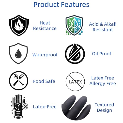 Designed for Food Handling: Our 5MIL black nitrile gloves powder-free latex-free. Tear resistance, oil resistance and waterproof. The textured fingertips provide a non-slip grip and resist punctures from sharp tools. Essential bbq gloves heat resistant cooking for Barbecue Masters and Home Chefs