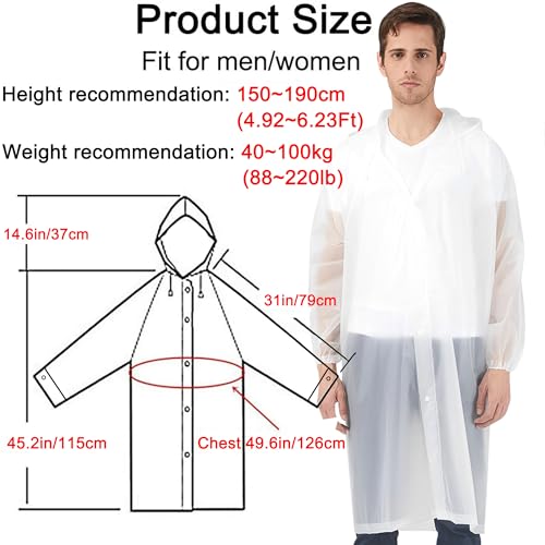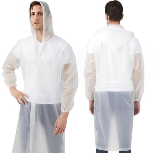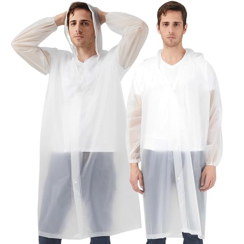 Rain Ponchos Raincoats for Adults, 2 Pcs Reusable Rain Jacket Coats with Hoods and Sleeves for Men Women (White)