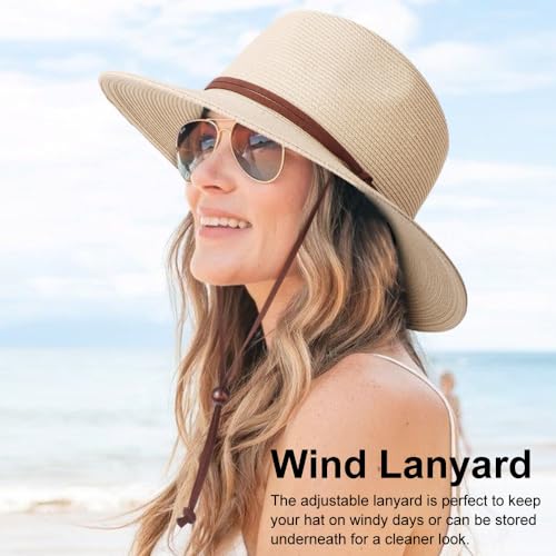 DRESHOW Women Straw Panama Hat Travel Fedora Beach Sun Hat Summer Wide Brim Straw Roll up Hat UPF 50+