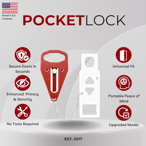 TRUSTED PROTECTION + U.S. SUPPORT – Ideal for women travelers, solo travelers, students, seniors, and renters seeking hotel door security and apartment safety. PocketLock is a proud U.S.A. company with responsive support. In the box: 1 portable door lock (with 2 inserts) with carrying case, 1 door stop alarm, quick-start guide.