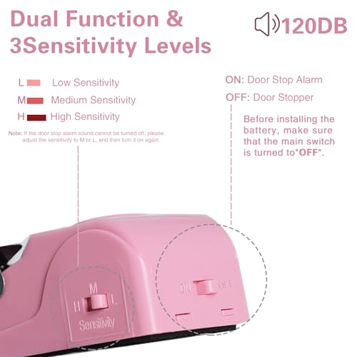 【Door Stop Alarm】This is an upgrade door stop than others,Stainless steel pressure plate,non-slip bottom,3 Sensitivity Levels – Low – Medium – High,with 120DB siren, Once someone opens the door,the door stopper alarm will go off in the first place,they will scaring away bad guys and helps wake you and give you time to find help.Require one 9v battery (Not include)