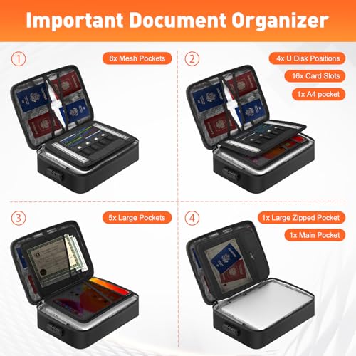 【Multi-Layer Design】14.4 x 10.6 x 4 inches of large capacity—this important document organizer features a multi-layer design including 8 passport mesh pockets, 16 card slots, 4 USB drive pockets, 1 A4 size folder layer, 5 large pockets, 1 large zipped pocket and 1 main compartment. Organize important documents, passports, laptops, certificates, cards, USB drives, and cash efficiently to meet all your storage needs.