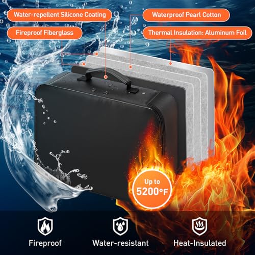 【5200°F Fireproof & Water-resistant】Featuring a silicone coating and aluminum foil lining, the fireproof document bag withstands temperatures up to 5200°F. Rigorous testing confirms the aluminum foil lining provides effective thermal insulation at extreme heat, safeguarding contents. The silicone coating delivers water-resistant protection against accidental spills, rain, and even floodwater.