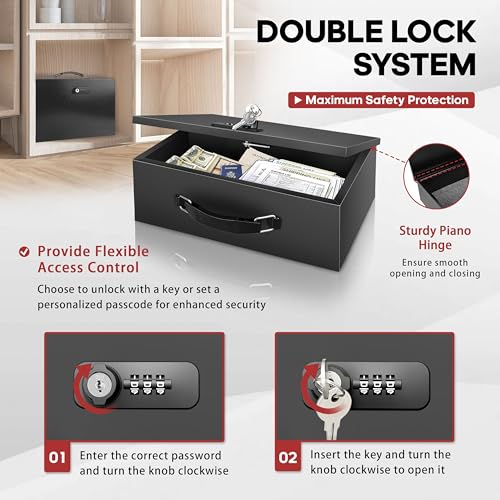 [Advanced Fireproof & Waterproof Protection] The fireproof lock box is built with double cold-rolled steel and fire-resistant insulation, our safe box can withstand extreme temperatures and moisture, keeping your valuables protected in case of fires, floods, or humidity.